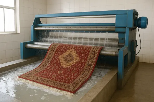 - آبگیری با دستگاههای لولهای (سانتریفیوژ): این دستگاهها با سرعت بالا، تمامی آب اضافی را بدون ایجاد شکستگی و چروک از بافت فرش خارج میکنند.