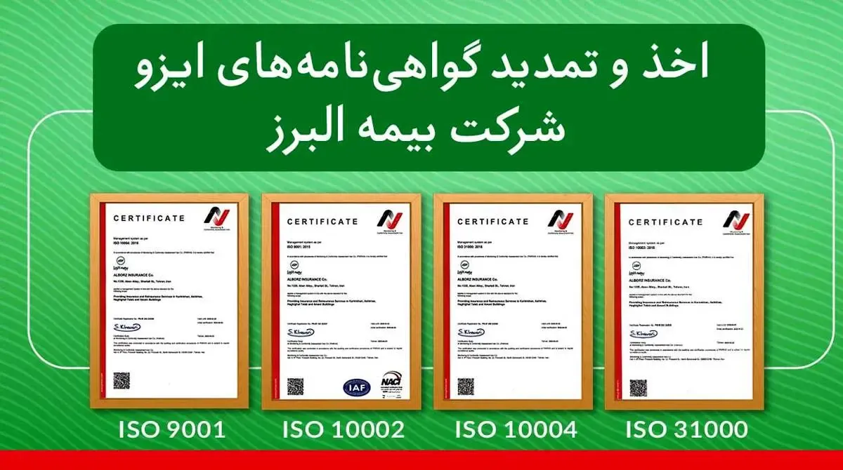 همچنین بیمه البرز در سال جاری با اعمال استانداردهای سیستم مدیریت کیفیت توانست گواهینامه ایزو ۹۰۰۱ خود را که سالهاست دریافت کرده است را مجددا تمدید کند.