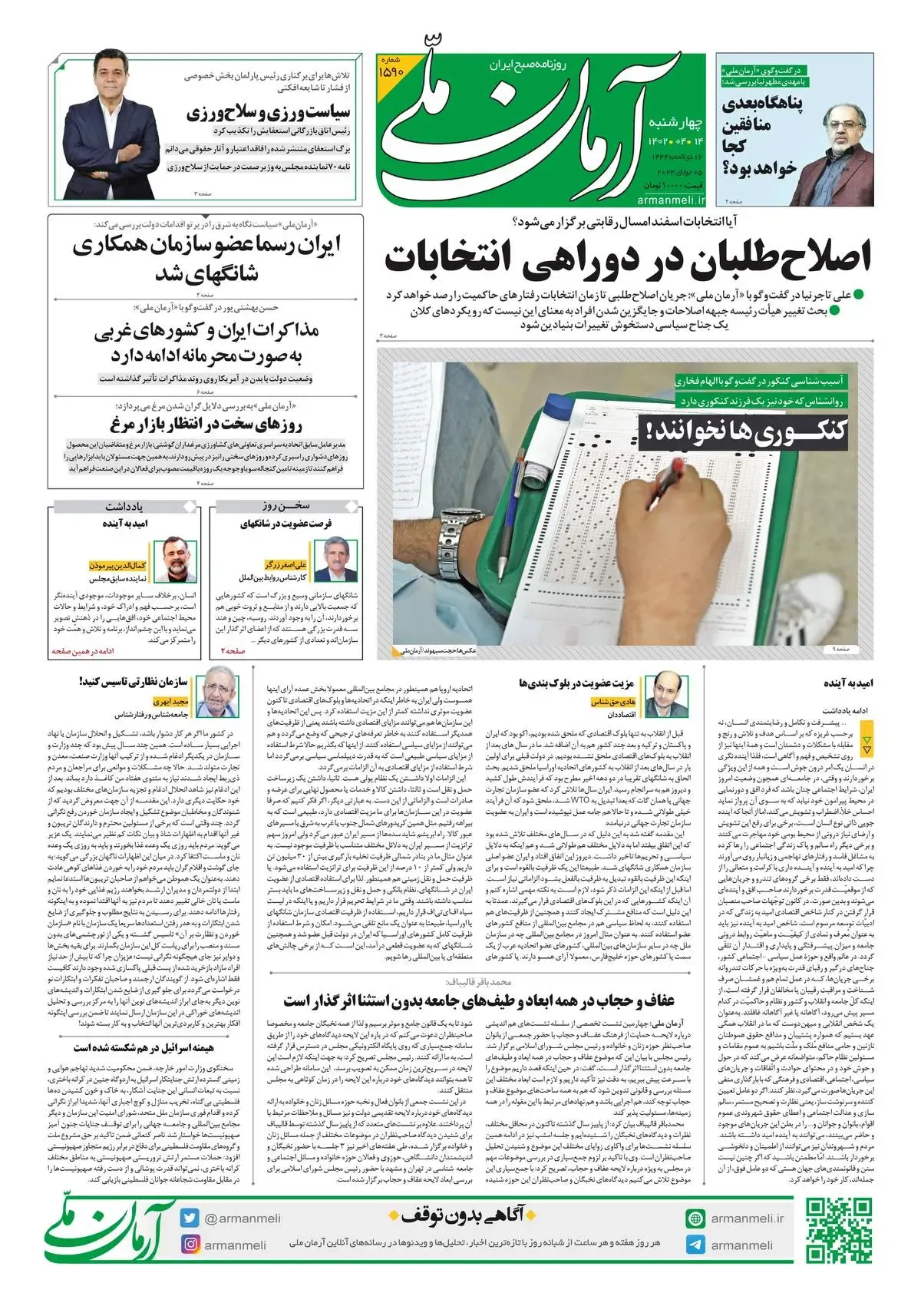 روزنامه آرمان ملی - چهارشنبه 14 تیر - شماره 1590