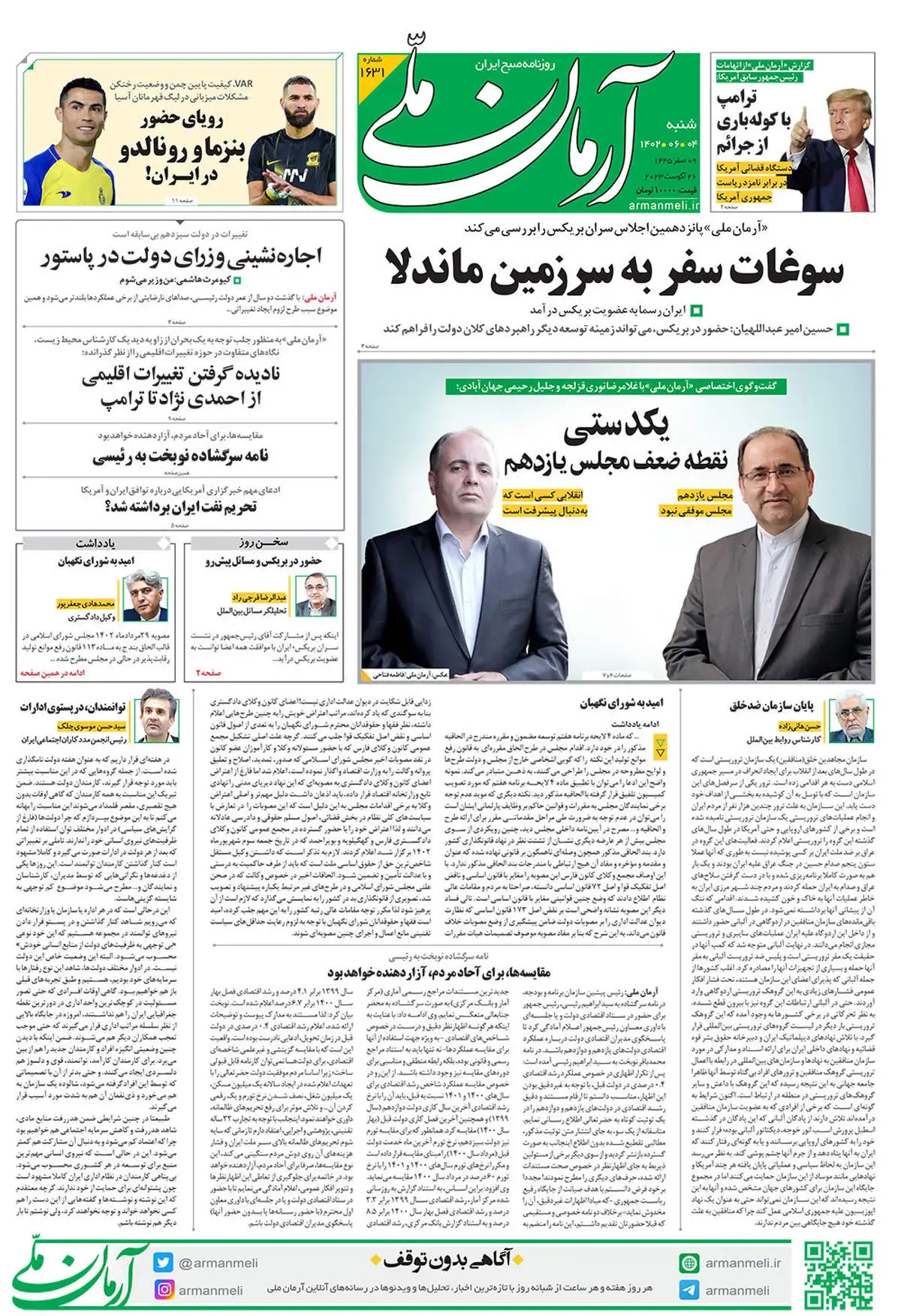 روزنامه آرمان ملی - شنبه 4 شهریور - شماره 1631