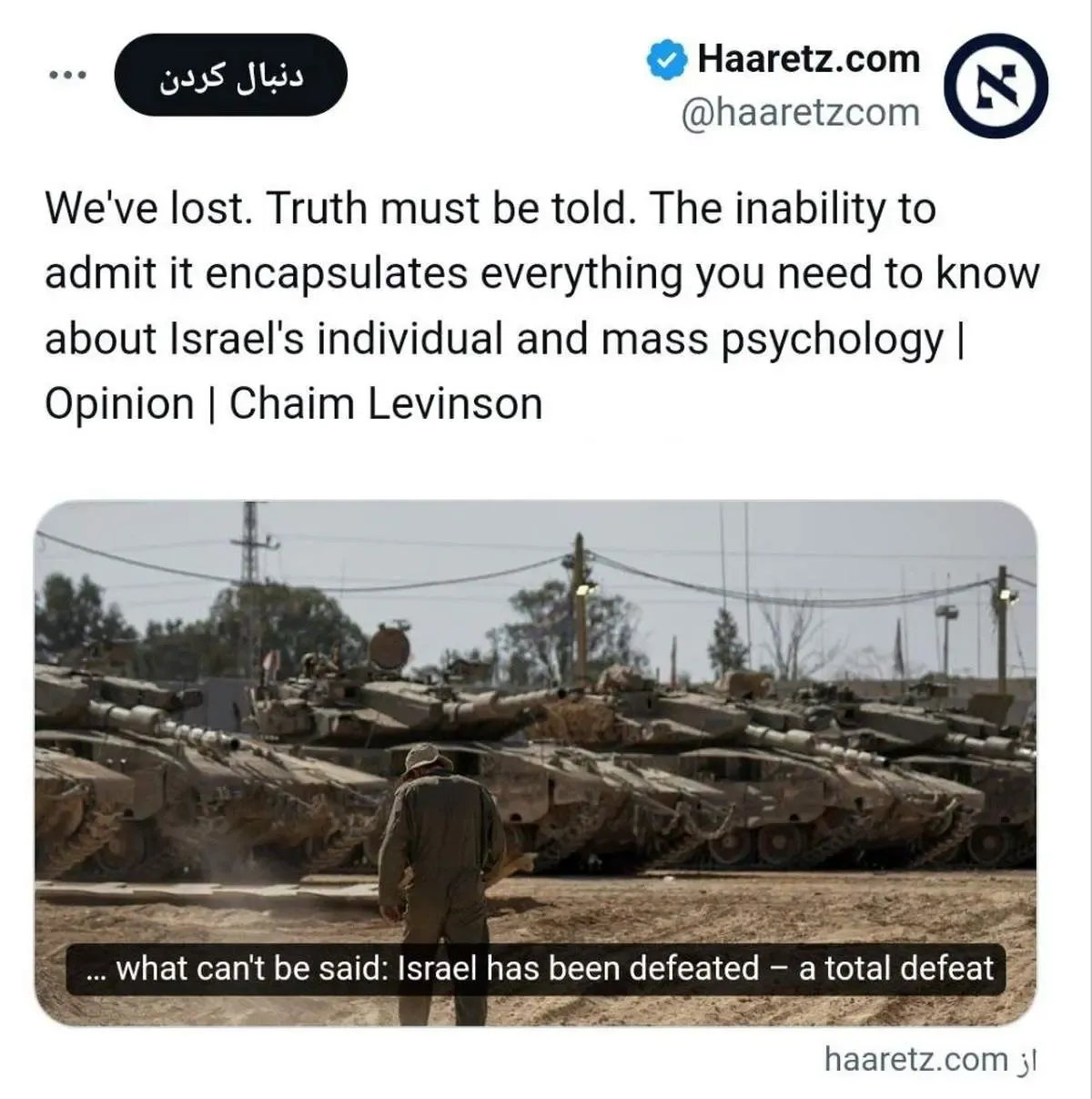 روزنامه صهیونیستی هاآرتص در یادداشتی به قلم هیم لوینسون نوشت: ما باختیم، حقیقت را باید گفت. ناتوانی در اعتراف آن همه چیزهایی را که باید در مورد روانشناسی فردی و جمعی اسرائیل بدانید را در برمی گیرد.