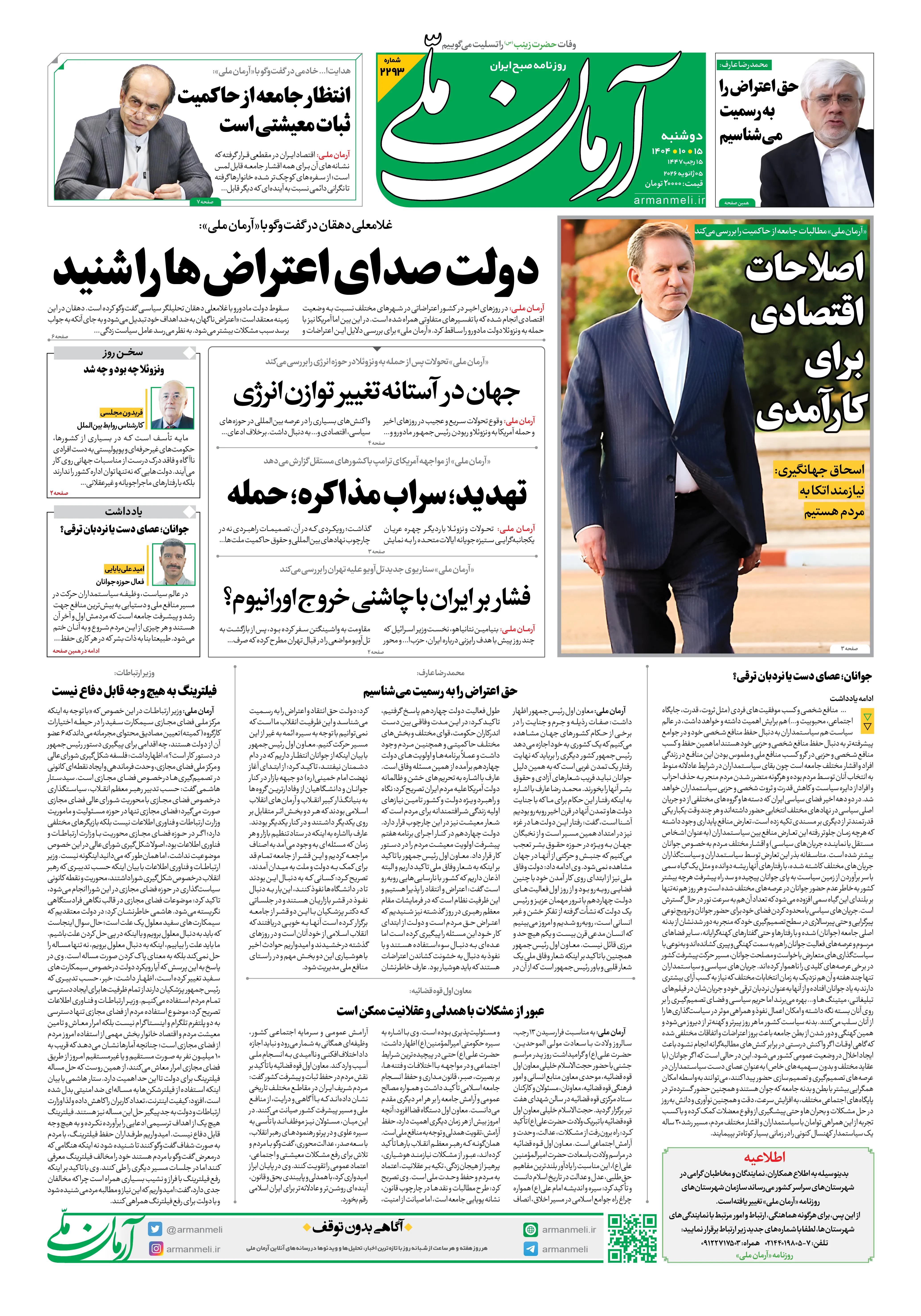 روزنامه آرمان ملی دوشنبه- 15دی- 1404 شماره 2293