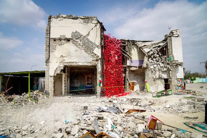 نقاشیهای دانشآموزان بر روی دیوار مدرسه هنوز بر روی دیوار است. نیمکتی در سایه دیوارهایی رنگی استوار است، با اینکه از مدرسه، ویرانهای باقی مانده و دانشآموزان شهید شدهاند اما ذهن از ناخودآگاه جمعی صدای دانشآموزان محیط مدرسه و کلاس درس را فرامیخواند.