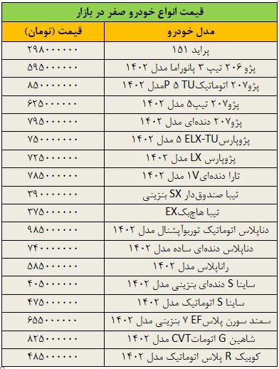 تارا دنده‌ای V۱ مدل ۱۴۰۲ در حدود ۵ میلیون تومان کاهش قیمت را تجربه کرد و ۷۸۵ میلیون تومان قیمت خورد. در مقابل، البته قیمت تیبا صندوق‌دار SX بنزینی مدل ۱۴۰۱ به ۳۹۰ میلیون تومان رسید و تیبا هاچ‌بک EX هم ۳۷۵ میلیون تومان به فروش رفت.گزارش‌های میدانی از بازار خودرو نشان می‌دهد قیمت دناپلاس اتوماتیک توربوآپشنال مدل ۱۴۰۲ در بازار ۵ میلیون تومان ارزان شد و ۹۸۵ میلیون تومان قیمت پیدا کرد. قیمت دناپلاس دنده‌ای ساده مدل ۱۴۰۲ هم با کاهش ۱۰ میلیون تومانی، به ۷۴۰ میلیون تومان رسید.اما راناپلاس بدون تغییر، به قیمت ۵۸۵ میلیون تومان به فروش رفت. در عین حال، ساینا S دنده‌ای بنزینی مدل ۱۴۰۲ به قیمت ۴۰۵ میلیون تومان و ساینا S اتوماتیک مدل ۱۴۰۲ به قیمت ۴۷۵ میلیون تومان به فروش رفت.در این میان، سمند سورن پلاس EF۷ بنزینی مدل ۱۴۰۲ بدون تغییر، ۶۵۵ میلیون تومان قیمت خورد. شاهین G اتومات CVT مدل ۱۴۰۲ هم با کاهش ۵ میلیون تومانی، ۸۲۵ میلیون تومان به فروش رفت.کوییک GX L دنده‌ای ۳۵۹ میلیون تومان بود. کوییک R پلاس اتوماتیک هم بدون تغییر، به قیمت ۴۸۵ میلیون تومان به فروش رفت.