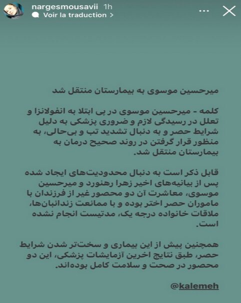 نرگس موسوی، دختر میرحسین موسوی ابتلا به آنفو لانزا و انتقال پدرش به بیمارستان را تائید کرد.