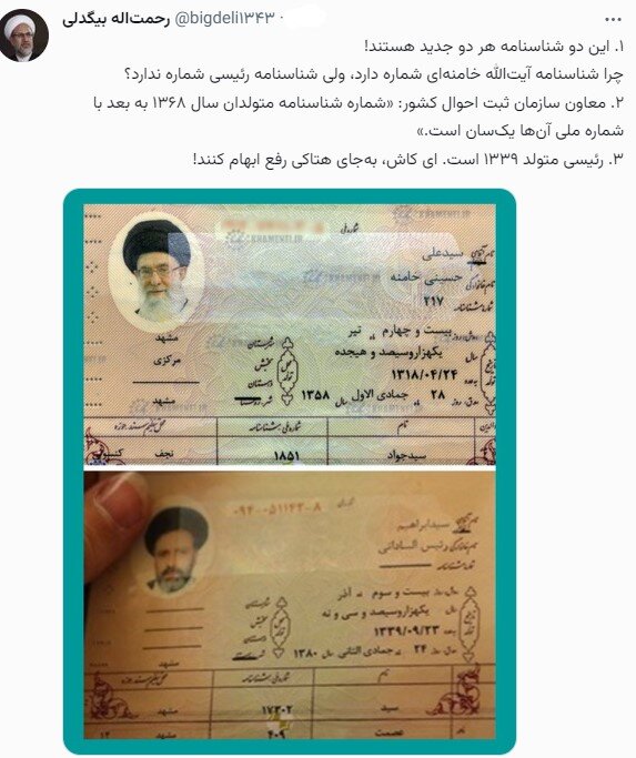آرمان ملی آنلاین خبرآنلاین نوشت،رحمت‌اله بیگدلی، فعال سیاسی اصلاح‌طلب با انتشار تصاویری از شاسنامه رهبر انقلاب و رئیسی نوشت: