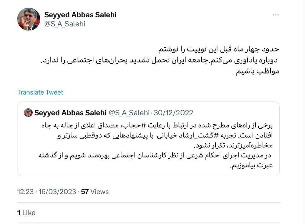 خبرآنلاین نوشت، سیدعباس صالحی، مدیر روزنامه اطلاعات و وزیر سابق ارشاد ضمن بازنشر توییت چهار ماه قبل خود نوشت :