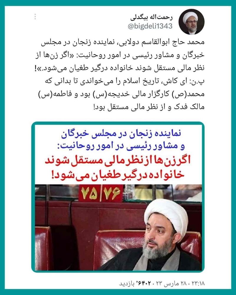 «رحمت اله بیگدلی» فعال سیاسی اصلاحطلب در واکنش به اظهارات مشاور رئیسی در امور روحانیت درباره استقلال مالی زنان در صفحه شخصی خود نوشت: