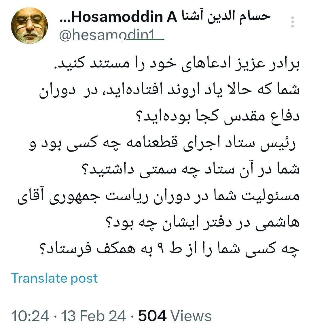 به گزارش آرمان ملی آنلاین و به نقل از خبرآنلاین، حسامالدین آشنا، مشاور رئیس جمهور در دولت های یازدهم و دوازدهم در واکنش به ادعای مطرحشده از سوی قدیری ابیانه که در برنامه «شیوه» صداوسیما گفته بود«روحانی اصرار داشت اروندرود را به صدام ببخشیم»، در شبکهی اجتماعی ایکس نوشت: