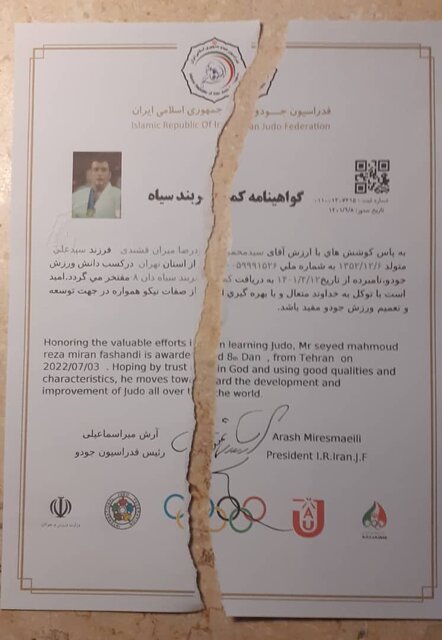 میران همچنین در اعتراض به این اتفاقات، حکم میر دان هشتی را که آرش میراسماعیلی، رئیس فدراسیون جودو به او داده بود، پاره کرد که تصویر آن را در ادامه مشاهده میکنید: